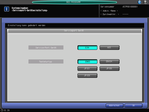 Drücken Sie auf [Systemeingaben] im Bildschirm [Bedienereinstellung] und drücken Sie dann auf [Serviceport Gerät].