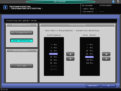 Wählen Sie den Energiesparmodus, der aktiviert werden soll, wenn auf Energie sparen am Bedienfeld gedrückt wird. Wählen Sie außerdem die Zeiten für die Aktivierung der Auto Stromsparfunktion/Autom. Abschaltung. Sie können auch die Bedingung für die automatische Reaktivierung festlegen, um das System zu aktivieren, wenn ein Druckauftrag bei aktiver automatischer Abschaltung empfangen wird.
