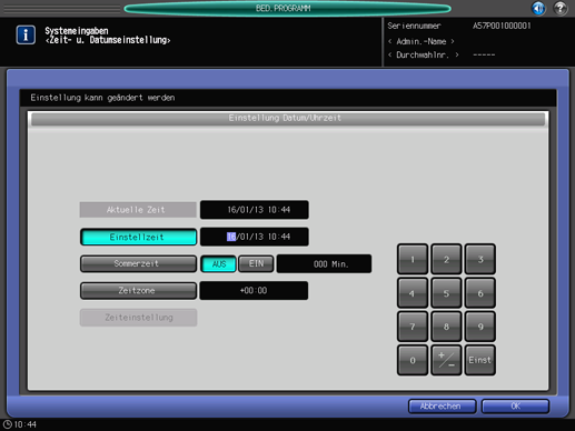 Richten Sie sich bei den weiteren Schritten nach der Vorgehensweise unter [Benutzereinstellung] - [Systemeingaben] - [Einstellung Datum/Uhrzeit]. Ausführliche Informationen finden Sie Datums-/Uhrzeiteinstellung: Festlegen von Datum und Uhrzeit.
