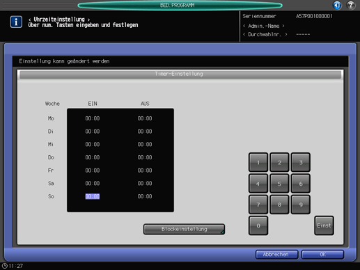 Geben Sie anhand der Tastatur am Touch Display oder über die Tastatur am Bedienfeld die gewünschte Ein-/Ausschaltzeit ein. Drücken Sie auf [Einst], um den hervorgehobenen Bereich zu verschieben.