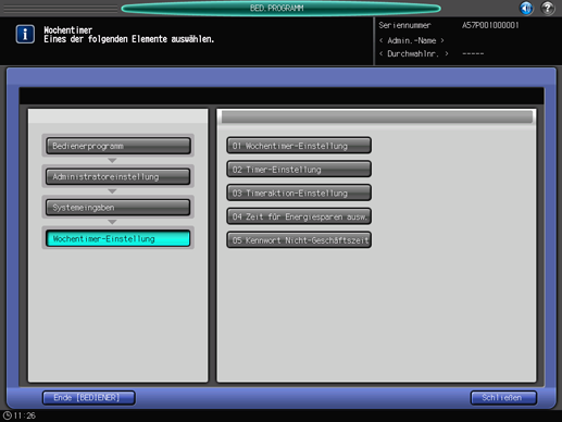 2. Drücken Sie auf [Systemeingaben] im Bildschirm [Systemadministratoreinstellung] und drücken Sie dann nacheinander auf [Wochentimer-Einstellung] und [Zeit für Energiesparen ausw.].