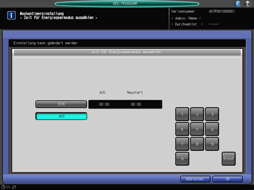 • Geben Sie anhand der Tastatur am Touch Display oder über die Tastatur am Bedienfeld die gewünschte Ausschaltzeit (im 24-Stunden-Format) ein. Drücken Sie auf [Einst] und geben Sie dann auf die gleiche Weise die Neustartzeit ein.