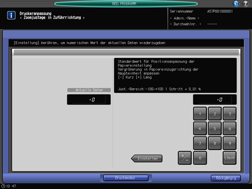Dieser Vorgang ist mit dem Vorgang unter [Justage] - [Systemjustage] - [Druckerjustage] - [Vergröß.jus. Einzugsrichtung] (aufrufbar über den Bildschirm [GERÄT]) identisch.
