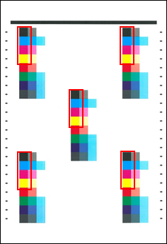 Messen Sie mit einem Farbmessgerät jeweils die vier Farben (BK, C, M, Y) der fünf Farbmuster im rot eingerahmten Bereich und berechnen Sie den Durchschnitt jeder Farbe.