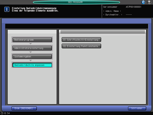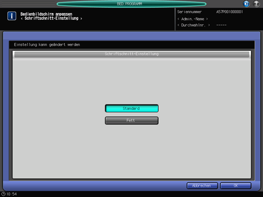 Drücken Sie auf [Systemeingaben] im Bildschirm [Systemadministratoreinstellung] und drücken Sie dann nacheinander auf [Bedienbildschirm anpassen] und [Schriftschnitt-Einstellung].