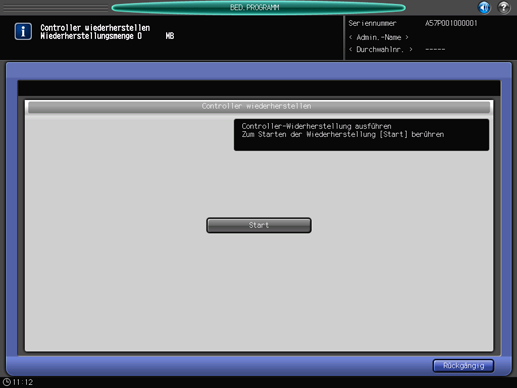 Drücken Sie im Bildschirm auf [Start], um die Wiederherstellung der im Bildcontroller gespeicherten Einstellungsdaten zu starten.
