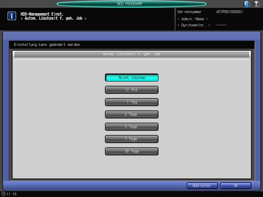Wenn Sie die Änderung abbrechen möchten, drücken Sie auf [Abbrechen]. In beiden Fällen wird wieder der Bildschirm [HDD-Verwaltungseinstell.] angezeigt.