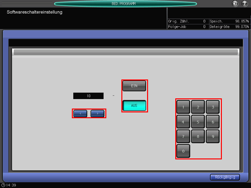 Geben Sie anhand der Pfeiltasten oder über die Tastatur am Touch Display die Schalternummer ein und wählen Sie dann entweder [Ein] oder [Aus].