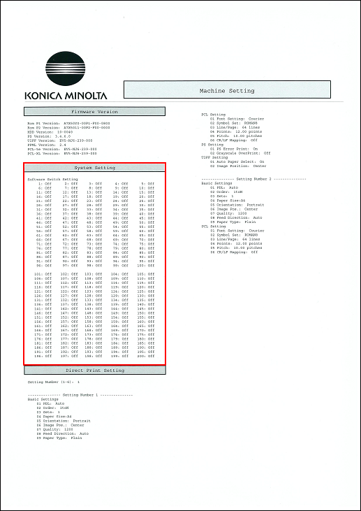 Die Parameter für die Softwareschalter können Sie im Systemeinstellungsbericht überprüfen. Ausführliche Informationen finden Sie Berichttyp: Ausgeben eines Berichts.