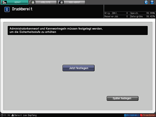 Wenn Sie auf [Jetzt festlegen] drücken, wird der Bildschirm [Schnel.Sich.einst.] angezeigt. Wenden Sie sich in dem Fall an den Administrator Ihres Systems. Wenn Sie auf [Schließen] drücken, wird der Standardbildschirm angezeigt und Sie können das System ganz normal verwenden.