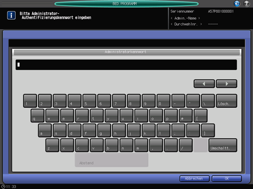 Wenn Sie auf [Jetzt festlegen] drücken, wird der Bildschirm [Administratorkennwort] angezeigt. Drücken Sie in dem Fall auf [Abbrechen]. Der Standardbildschirm wird angezeigt und Sie können das System ganz normal verwenden.