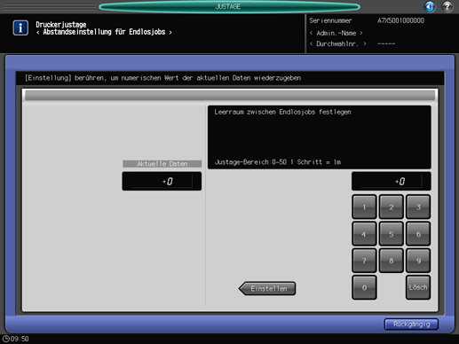 Drücken Sie auf [Systemeingaben] im Bildschirm [Systemadministratoreinstellung] und drücken Sie dann nacheinander auf [Expertenjustage], [Druckerjustage] und [Abstandseinstellung für Endlosjobs].