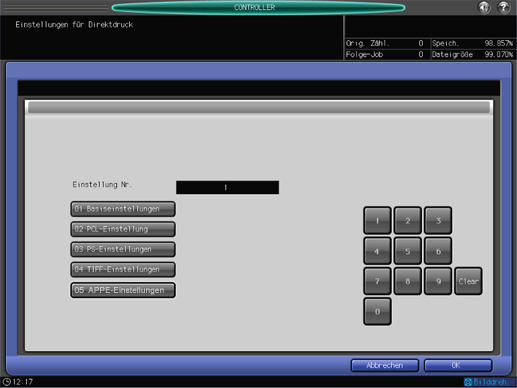 Dieser Bildschirm wird angezeigt, wenn Sie auf [Einstellungen für Direktdruck] im Bildschirm [Controller-Systemeinstellungsmenü] drücken. Ausführliche Informationen darüber, wie der Bildschirm [Controller-Systemeinstellungsmenü] aufgerufen wird, finden Sie CONTROLLER: Einrichten des Controllers.