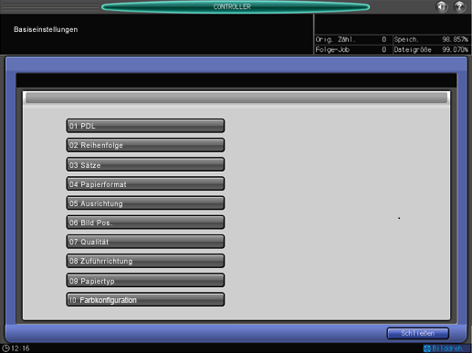 Dieser Bildschirm wird angezeigt, wenn Sie auf [Einstellungen für Direktdruck] - [Basiseinstellungen] im Bildschirm [Controller-Systemeinstellungsmenü] drücken. Ausführliche Informationen darüber, wie der Bildschirm [Controller-Systemeinstellungsmenü] aufgerufen wird, finden Sie CONTROLLER: Einrichten des Controllers.
