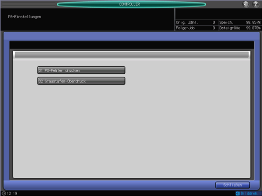 Dieser Bildschirm wird angezeigt, wenn Sie auf [Einstellungen für Direktdruck] - [PS-Einstellungen] im Bildschirm [Controller-Systemeinstellungsmenü] drücken. Ausführliche Informationen darüber, wie der Bildschirm [Controller-Systemeinstellungsmenü] aufgerufen wird, finden Sie CONTROLLER: Einrichten des Controllers.