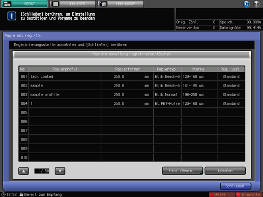 Ein [Papierprofil] kann hinzugefügt, bearbeitet und gelöscht werden.