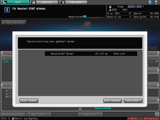 Der Bildschirm [GERÄT] wird wieder geöffnet und es wird die Meldung [Für Neustart START drücken.] angezeigt.