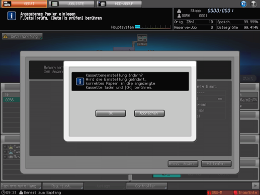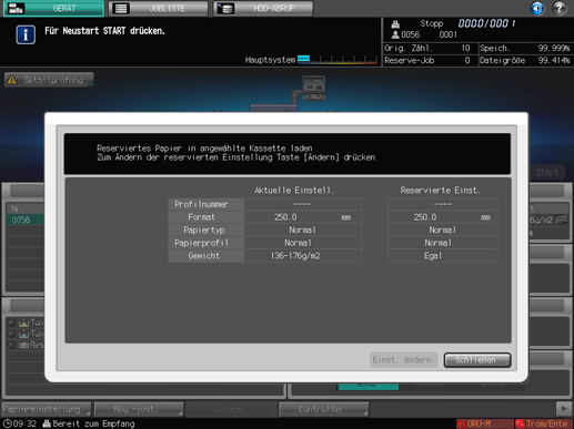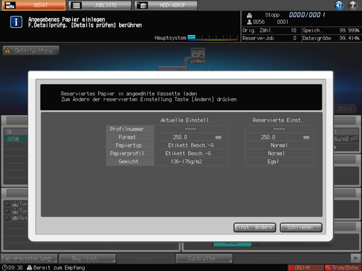 Die auf dem Hauptsystem unter [Papiereinstellung] (aktuelle Einstellung) angegebene Papiereinstellung und die im Druckjob festgelegte Papiereinstellung (reservierte Einstellung) werden angezeigt.