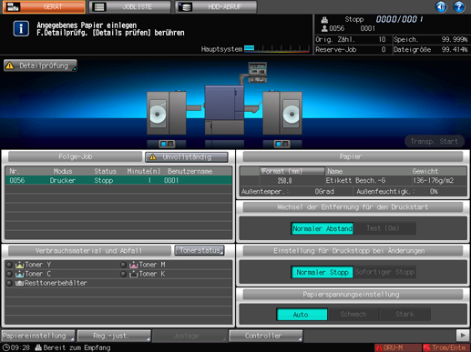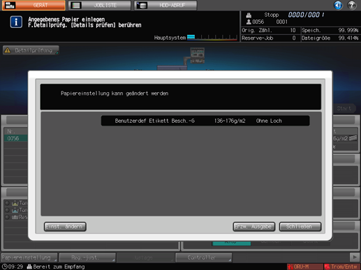 Wenn der Papiertyp, der im gesendeten Druckjob festgelegt ist, nicht mit dem in der [Papiereinstellung] des Hauptsystems angegebenen Papiertyp übereinstimmt, wird der Druckjob angehalten.