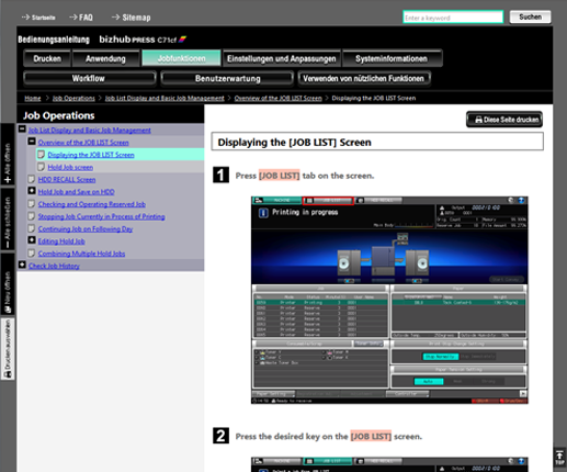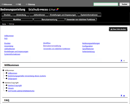 Das Suchfeld am oberen Bildschirmrand kann für die Suche nach Informationen in der Bedienungsanleitung genutzt werden. Geben Sie ein beliebiges Schlüsselwort in das Suchfeld ein und klicken Sie auf [Suchen].