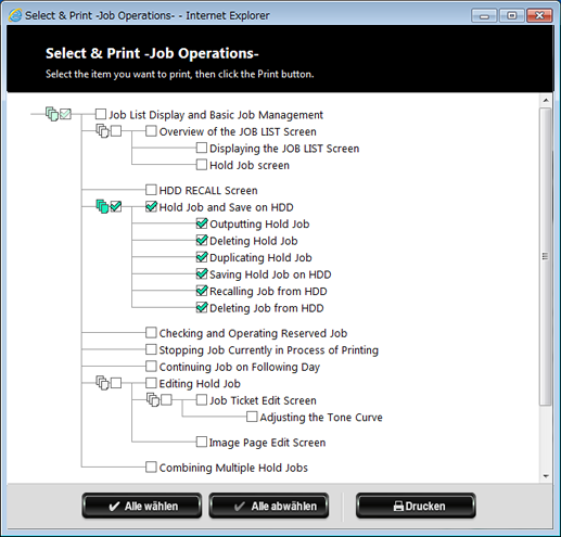 Wenn Sie auf [Drucken auswählen] im linken Bereich des Inhaltsverzeichnisses klicken, werden die Seiten des Inhaltsverzeichnisses mit Kontrollkästchen angezeigt.