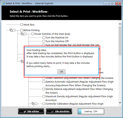 Unter Umständen kann es eine Weile dauern, bis die Seite [Drucken auswählen] angezeigt wird. Klicken Sie in diesem Fall nach der Prüfung der Inhalte im Fenster auf [OK] und warten Sie, bis die Seite geladen wird.