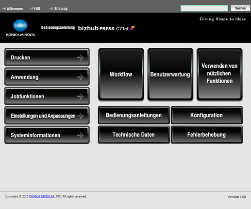 Sie können nach Informationen zu Druck- oder Anwendungsfunktionen oder zu den Tasten am Touch Display suchen.