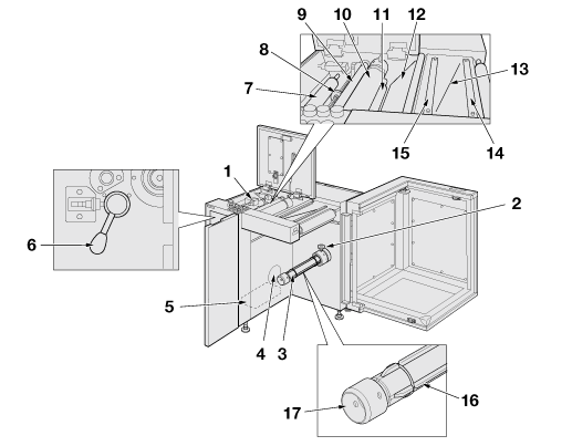 17 | Haltekeil-Vorschub-/-Rückzugshebel | Wird gedreht, um den Haltekeil nach oben oder unten zu bewegen, um den Medienkern zu fixieren oder zu entfernen. |