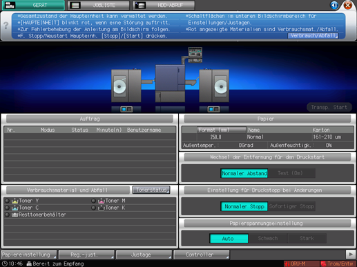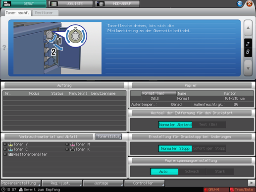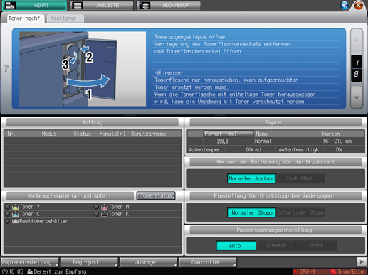 Wenn der Bildschirm [GERÄT] geöffnet ist, werden die Anweisungen für das Nachfüllen von Toner und den Austausch des Resttonerbehälters angezeigt.