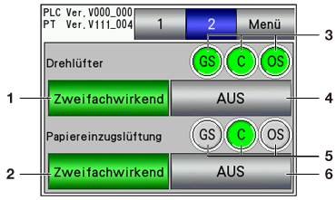 5 | [GS]/[C]/[OS] | Stellen Sie im normalen Betrieb sicher, dass die Elemente [GS]/[C]/[OS] auf Grün eingestellt sind. Wenn Sie den Betrieb überprüfen möchten, wählen Sie den zu überprüfenden Lüfter aus. [GS]: Lüfter auf der Zahnradseite [C]: Mittlerer Lüfter [OS]: Lüfter auf der Betriebsseite |