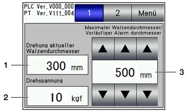 3 | [Maximaler Walzendurchmesser/Vorläufiger Alarmdurchmesser] | Geben Sie den maximalen Walzendurchmesser an, bei dem der Alarm ertönen soll. Wenn der maximale Durchmesser erkannt wird, ertönt der vorläufige Alarm und das System wird gemäß der Einstellung [Drehwalzendurchmesser-/Stopp] / [Drehwalzendurchmesser-/Warnung] im Bildschirm [Maschineneinstellung] betrieben. Bis zu 520 mm können angegeben werden. Wählen Sie im normalen Betrieb den Wert 500 mm. |