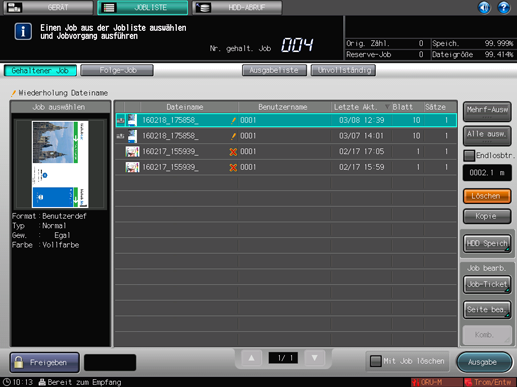 Drücken Sie auf den Job (einen Job), der bearbeitet werden soll, und drücken Sie dann auf [Job-Ticket] im Feld [Job bearb].