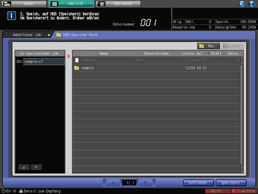 Zum Speichern im Stammverzeichnis der HDD drücken Sie in diesem Bildschirm auf [Speichern].