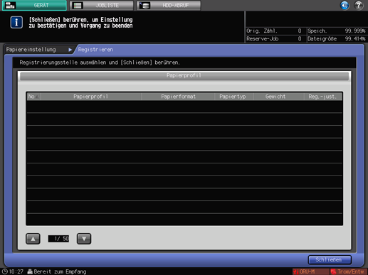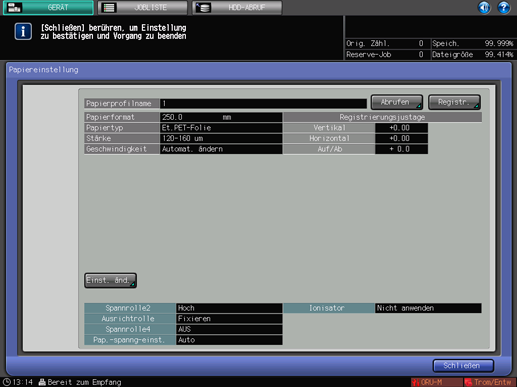 Um die Papiereinstellung direkt festzulegen, verwenden Sie den Bildschirm [Pap.einst.reg./lö.] (Siehe Papierprofil: Einrichten und Registrieren des Papiers im Bildschirm "Papiereinstellung registrieren/löschen").