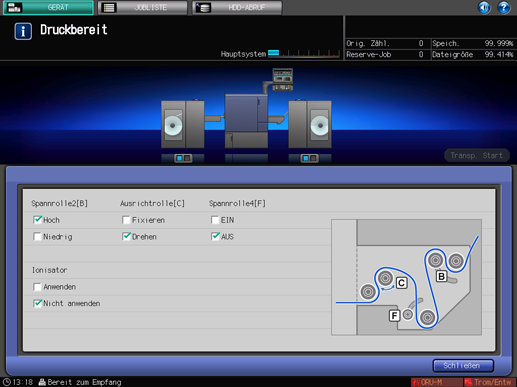 Aktivieren Sie die jeweiligen Kontrollkästchen entsprechend den Parametern für die Rollen des Einzugsbereichs oder legen Sie fest, ob der Ionisator verwendet werden soll, und drücken Sie dann auf [Schließen].
