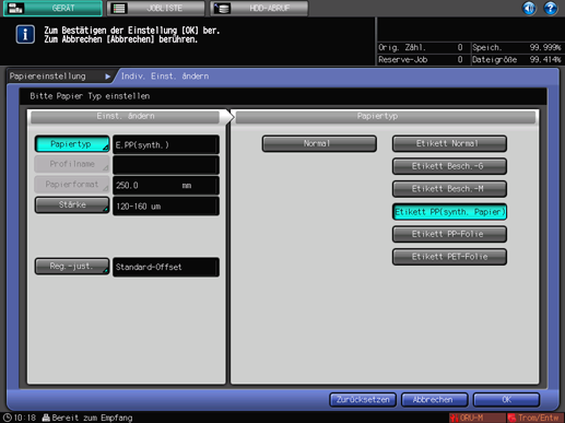 Beispiel: [Etikett PP(synth. Papier)] wird ausgewählt.