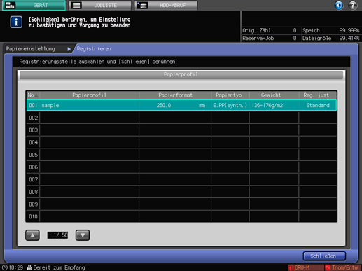 Überprüfen Sie, ob das Papierprofil registriert wurde, und drücken Sie auf [Schließen].