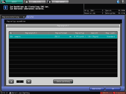 Drücken Sie auf das abzurufende Papierprofil und drücken Sie auf [OK].