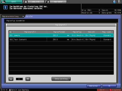 Drücken Sie auf das abzurufende Papierprofil und drücken Sie auf [OK].