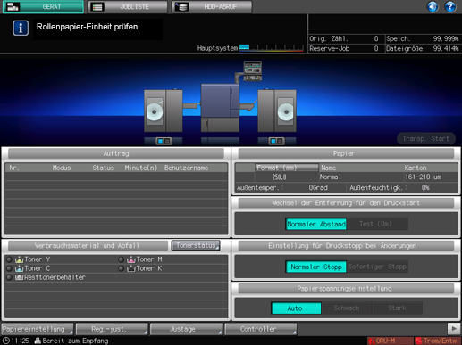Wenn die Meldung [Rollenpapier-Einheit prüfen] angezeigt wird, schalten Sie den Rollenwickler RW-101/Rollenwickler RW-201 ein und bereiten Sie ihn für die Ausgabe vor. Ausführliche Informationen finden Sie System vorbereiten.