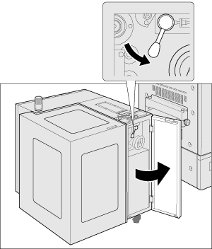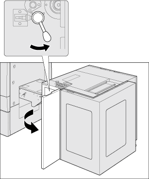 Öffnen Sie die Frontklappe des Rollenwicklers RW-201 und bewegen Sie den Hebel, um die Gummiwalze anzubringen.