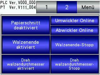 Wählen Sie im Touch Display des Rollenwicklers RW-201 [Menü] - [1,Maschinenstatus/2,Maschineneinstellung] - [2], um die Parameter für [Abwickler Online], [Umwickler Online] festzulegen.