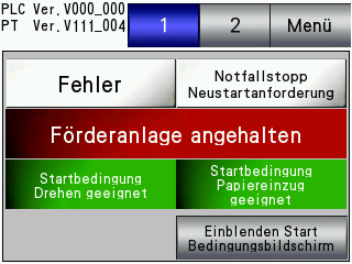 [Startbedingung Drehen geeignet] und [Startbedingung Papiereinzug geeignet] wird in grüner Farbe am Touch Display des Rollenwicklers RW-201 angezeigt.