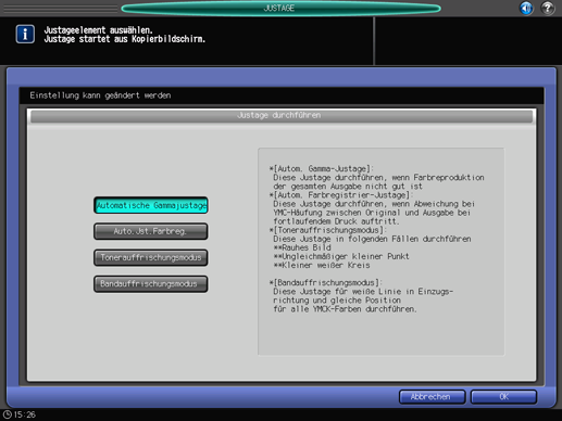 Ausführliche Informationen über die automatische Gamma-Justage finden Sie Automatische Gamma-Justage (Regulärer Justage-Ablauf (Hohe Genauigkeit / Justage-Ablauf beim Ändern des Rasters)).