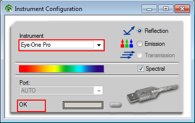 Wählen Sie unter [Instrument] das zu verwendende Spektralphotometer aus. Wenn [OK] angezeigt wird, schließen Sie den Bildschirm.