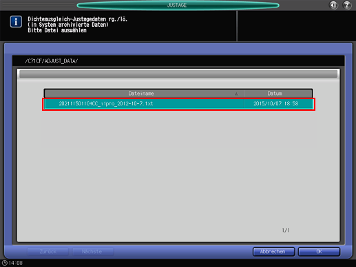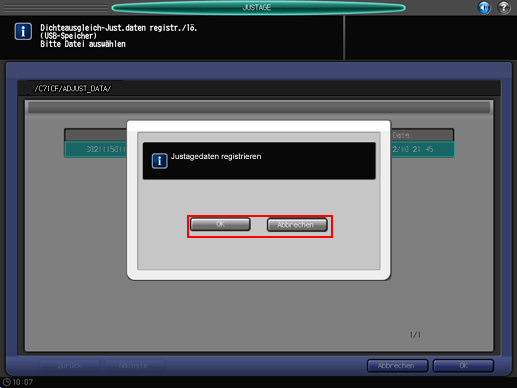 Drücken Sie auf dem Touch Display des Hauptsystems auf [Justage] im Bildschirm [GERÄT] und drücken Sie dann auf [Dichteausgleich-Justage] im Bildschirm [Justagemenü].