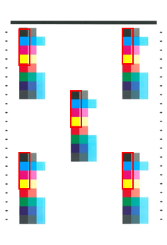 Messen Sie mit einem Farbmessgerät jeweils die vier Farben (BK, C, M, Y) der fünf Farbmuster im rot eingerahmten Bereich und berechnen Sie den Durchschnitt jeder Farbe.