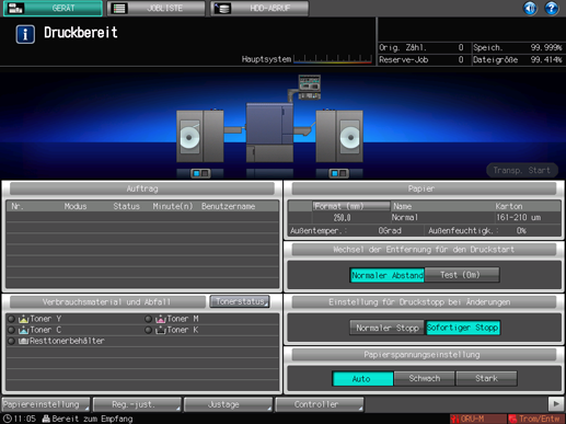 Drücken Sie auf [Sofortiger Stopp] in der [Einstellung für Druckstopp bei Änderungen] im Bildschirm [GERÄT] am [Touch Display] des Hauptsystems.