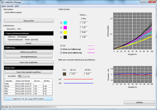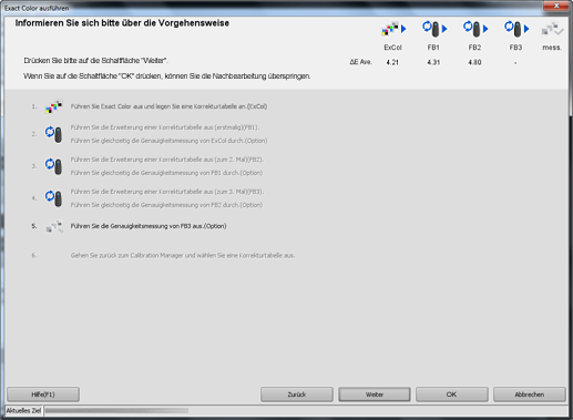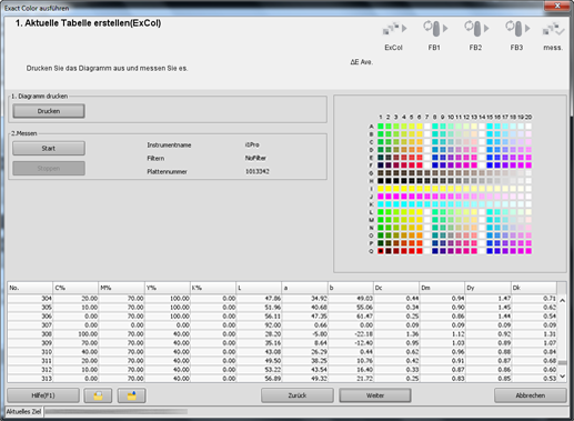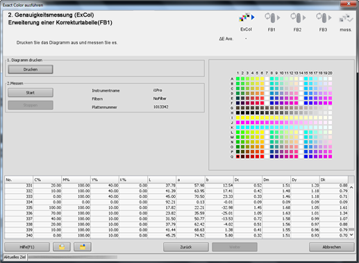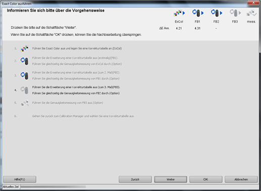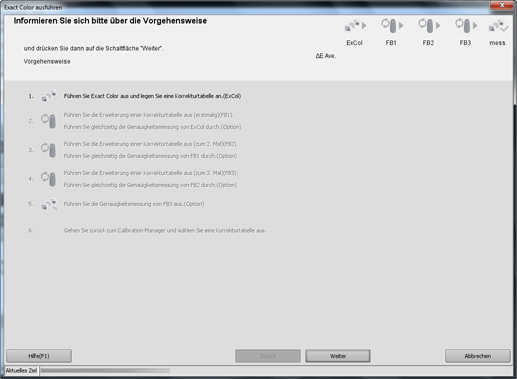 Mit Hilfe des Assistenten können Sie eine Korrekturtabelle mit der Exact Color-Funktion erstellen und die Korrekturtabelle im Controller anwenden, um die Genauigkeit der Farbreproduktion zu verbessern.