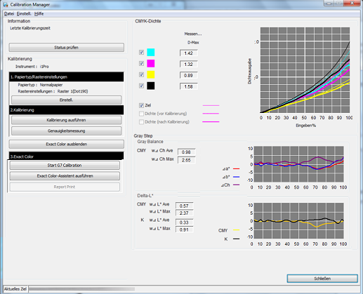 Wenn die Messung der Kalibrierungsgenauigkeit abgeschlossen ist, werden die Messergebnisse für die CMYK-Dichte und die Graureihe (Graubalance) angezeigt.